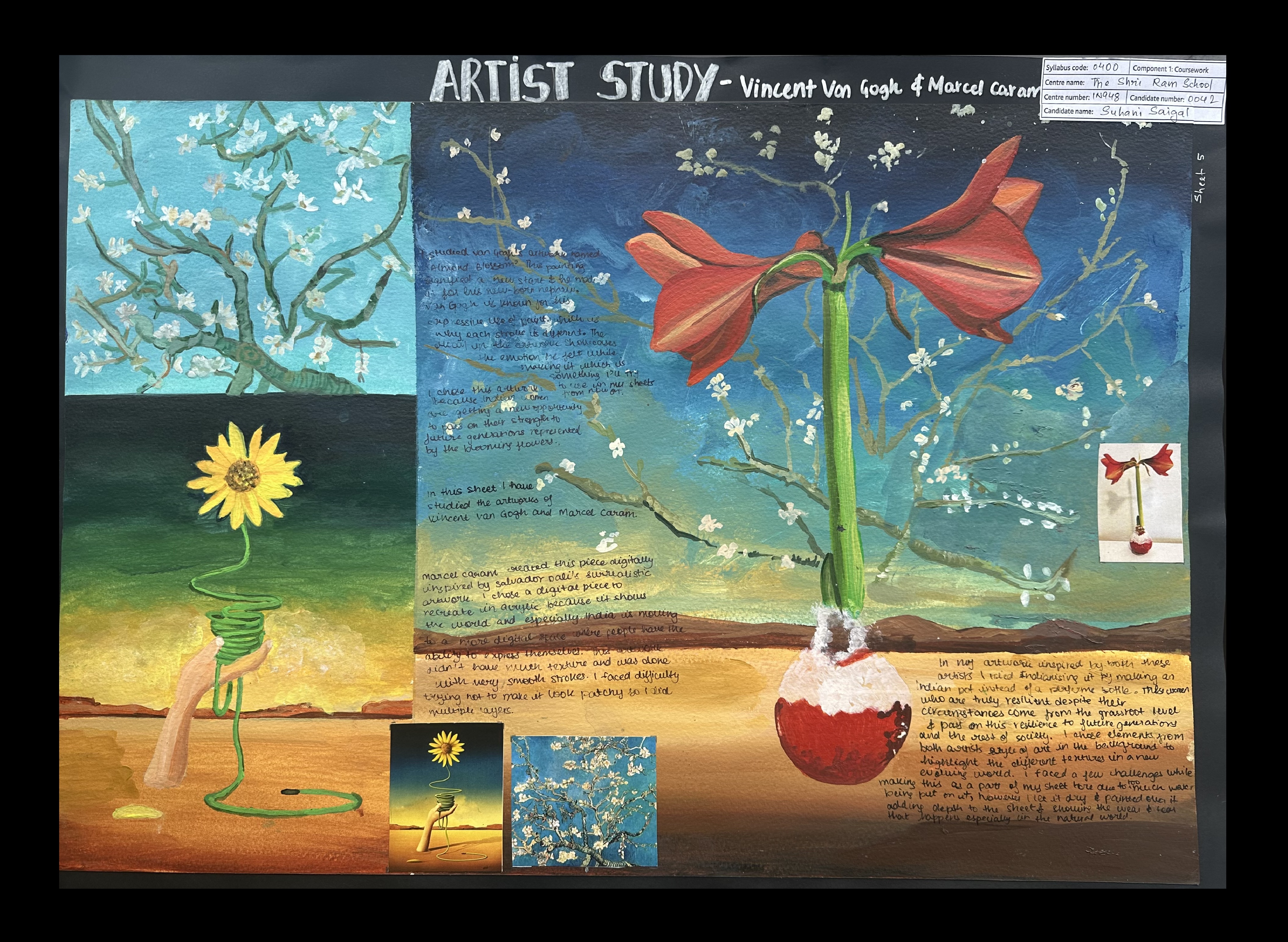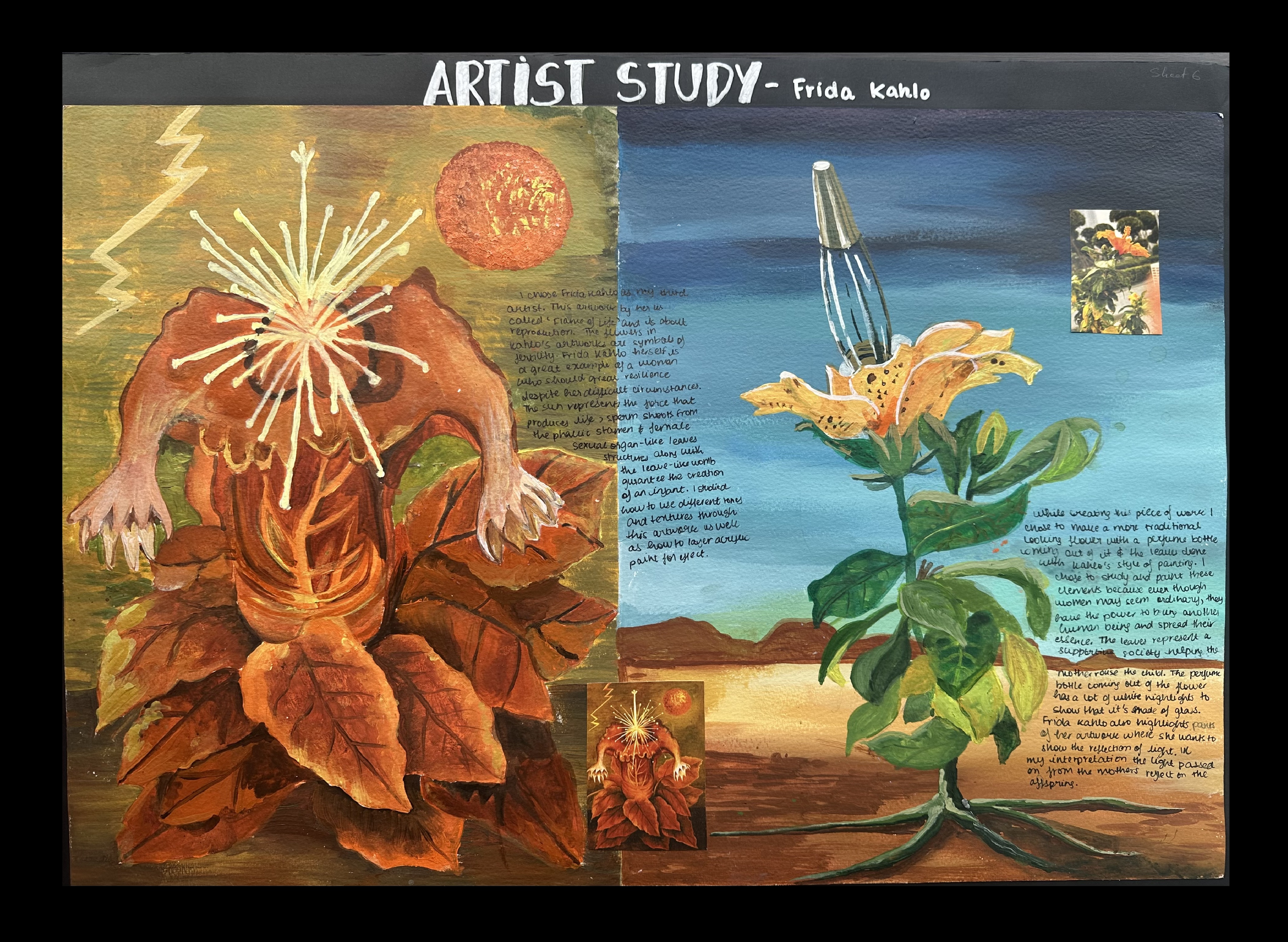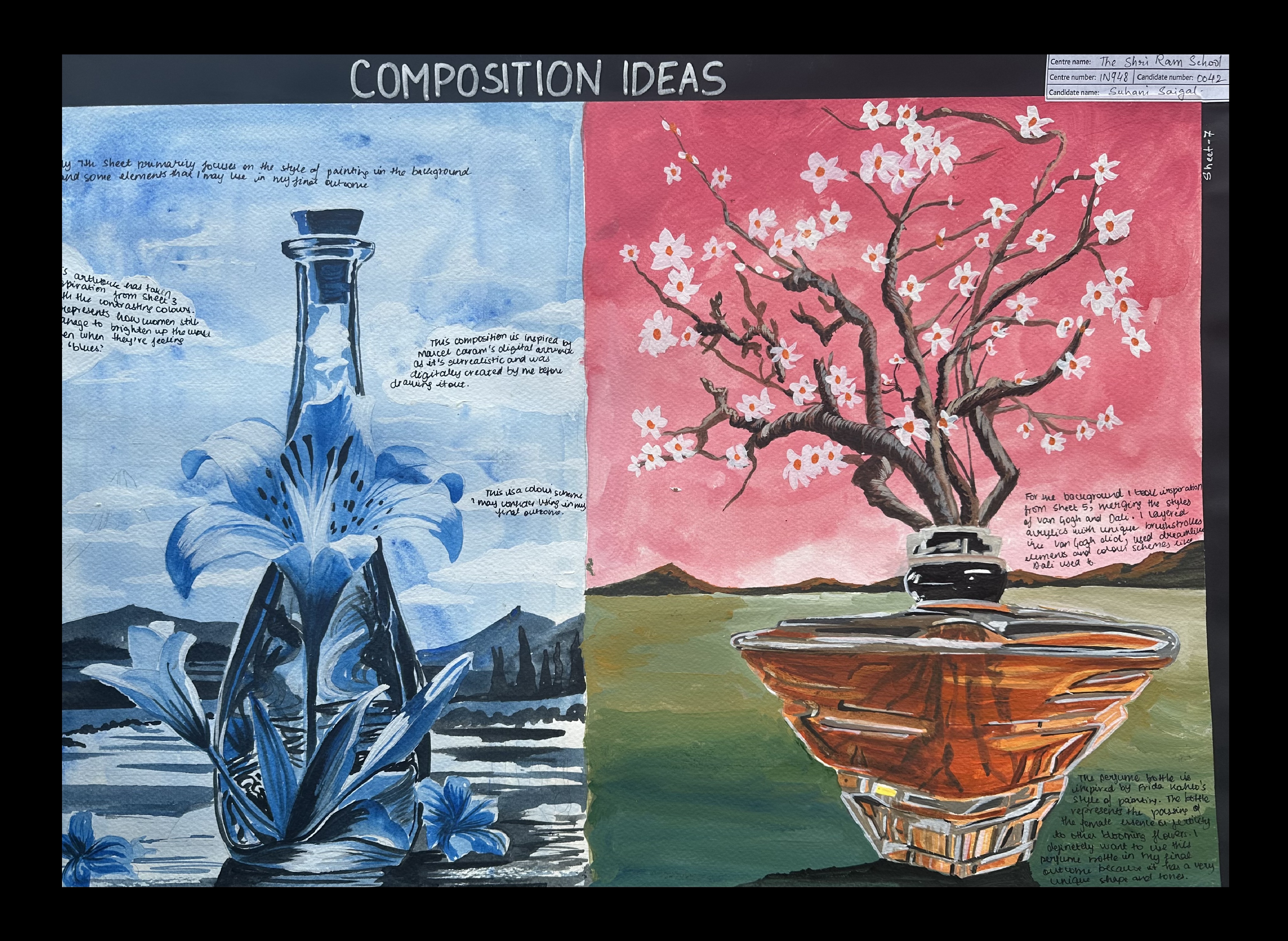This sheet, focusing on background, colour schemes, and key elements for my final outcome, reflects inspiration from all four artists—Marcel Caram, Vincent van Gogh, Salvador Dali, and Frida Kahlo. The artwork in blue tones, influenced by Marcel Caram’s digital style, was first created digitally, and then painted with watercolours, allowing smooth layering and effective shadow detailing. Drawing from Sheet 3, the contrast in colours represents how women, even at their lowest, still manage to brighten the world with their blossoming essence. For the second artwork’s background, I was inspired by Sheet 5, merging Van Gogh’s textured brushstrokes with Dali’s surreal, dreamlike elements using layered acrylics. Finally, echoing Frida Kahlo’s influence, the perfume bottle symbolises feminine essence and fertility, while the flowers growing from branches represent the passing down of femininity, something I aim to include in my final outcome.