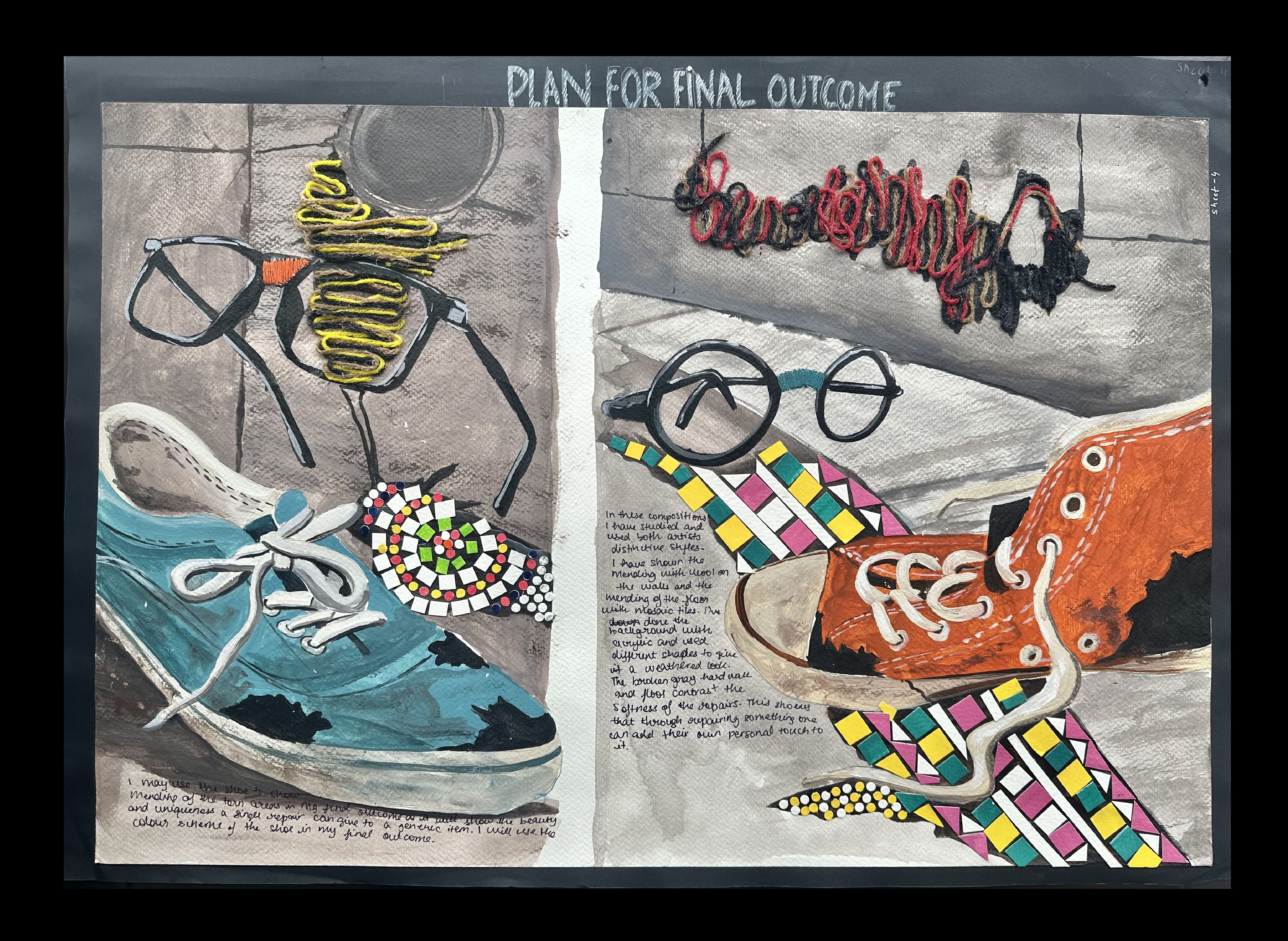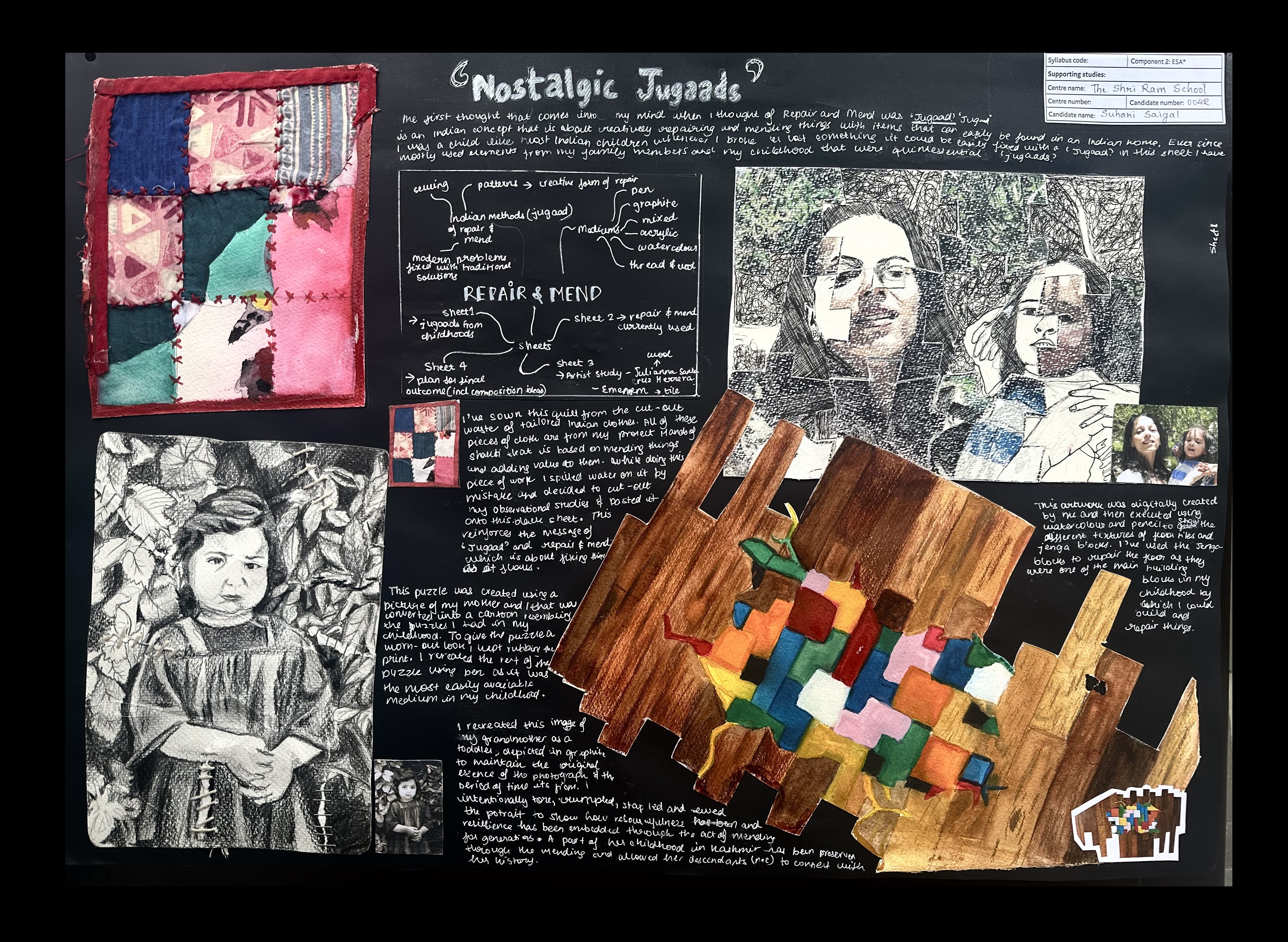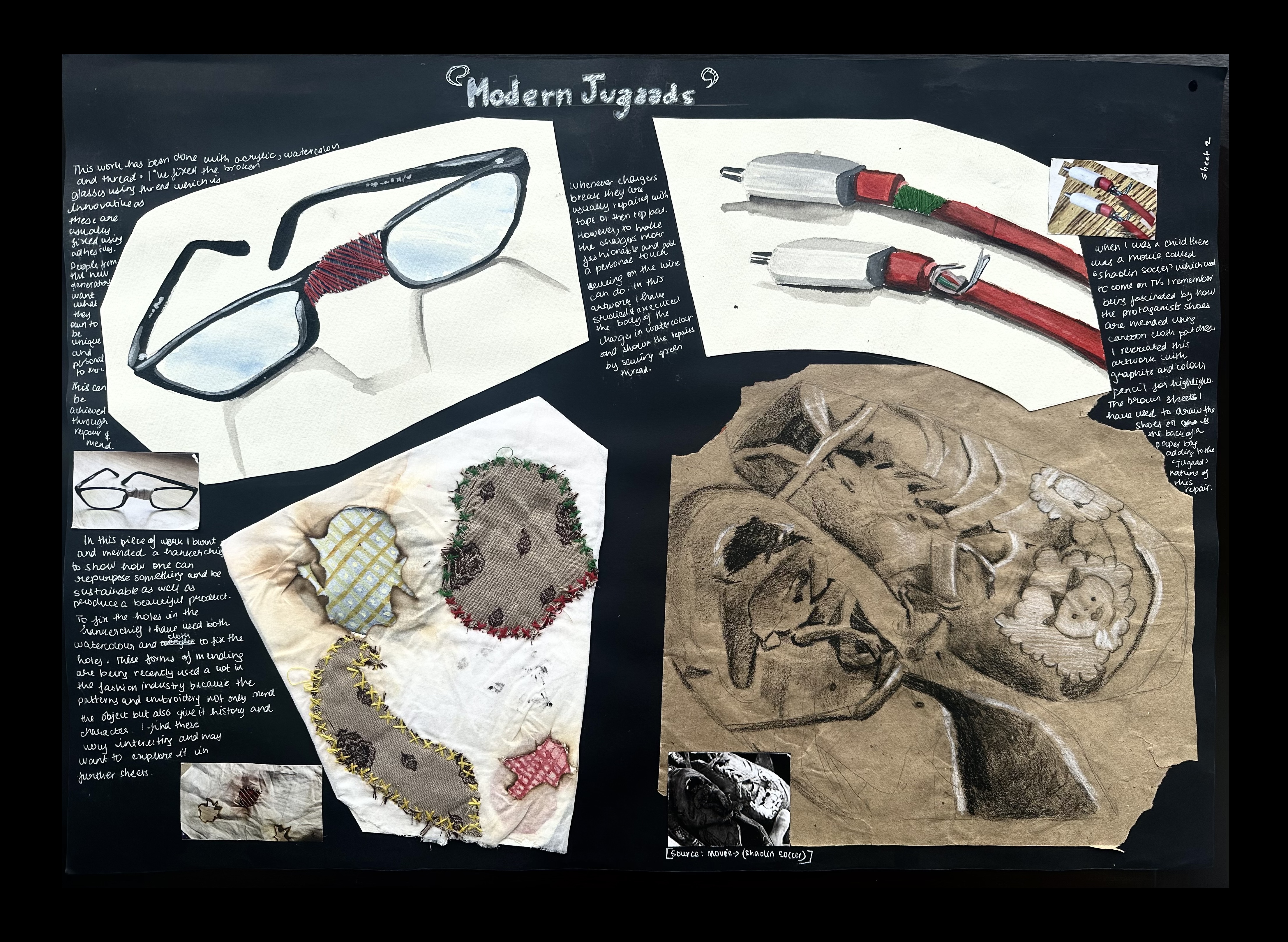 This sheet builds upon the generational theme of “repair and mend” by exploring how the idea of Jugaad has evolved in modern contexts. I began with a memory of using thread to mend my broken glasses, a quick fix that became a daily symbol of resilience; painting this in acrylic and watercolour to reflect both realism and sentimentality, overlaying text to contextualize the moment.