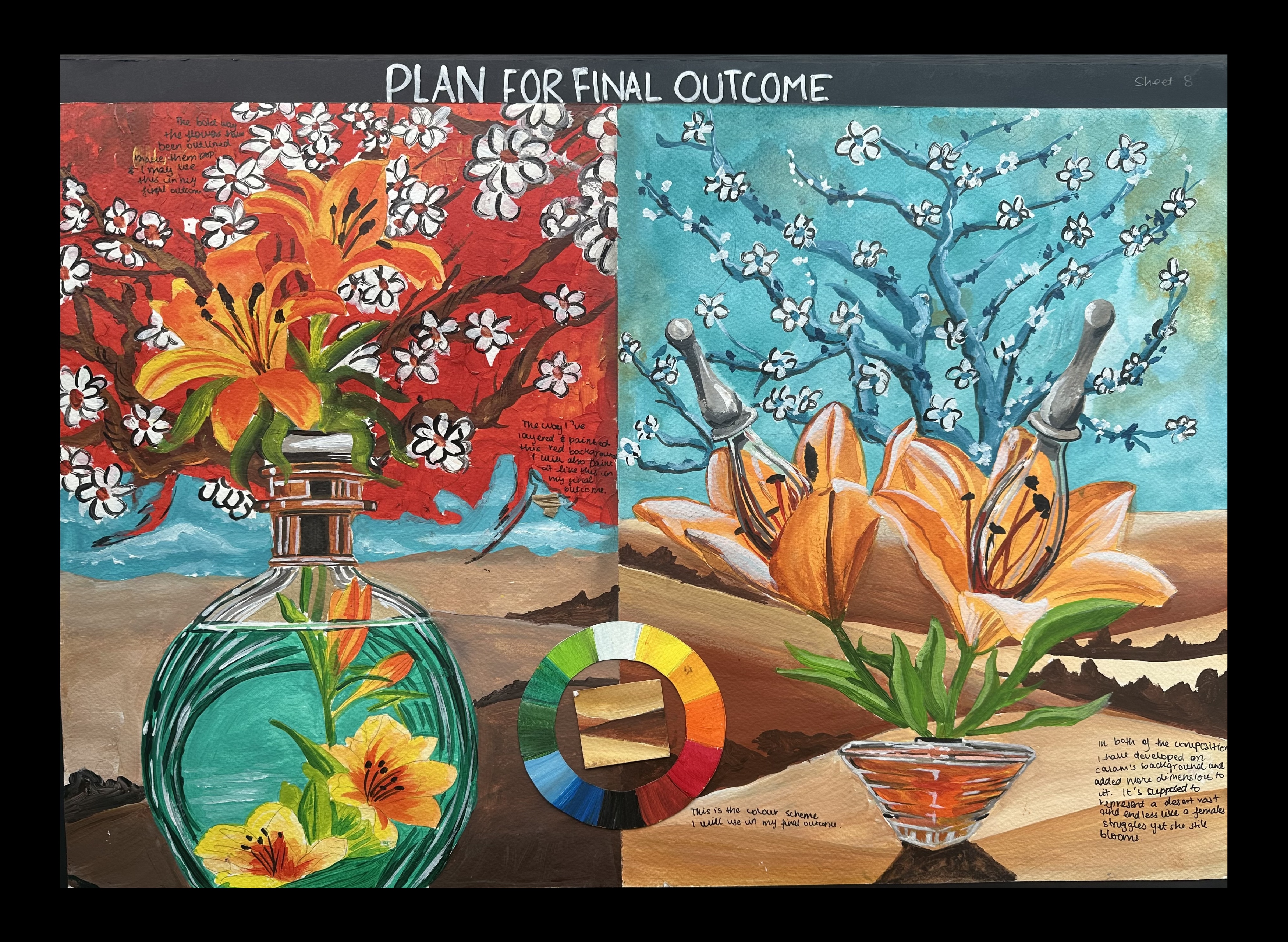 This final piece brings together all the visual and symbolic elements I’ve explored across my previous sheets, creating a culmination of my ideas around femininity, resilience, and generational strength. The blooming orange lilies represent the emergence of feminine power, no longer enclosed but standing tall in open air, each petal carefully shaped to reflect uniqueness. The almond blossoms, inspired by van Gogh, now appear against a fiery red background, suggesting that even amidst emotional intensity, growth and renewal are always possible. The traditional Indian bowl acts as both vessel and anchor, symbolising how women ground their strength in tradition while still blooming beyond it. The pipettes emerging from the lilies carry forward the idea of spreading essence and nurturing strength, echoing the motif of the perfume bottle in earlier works. Set against a surreal yet grounded landscape, this piece encapsulates the journey of feminine essence, from containment and quiet resilience to vibrant expression and collective transformation.