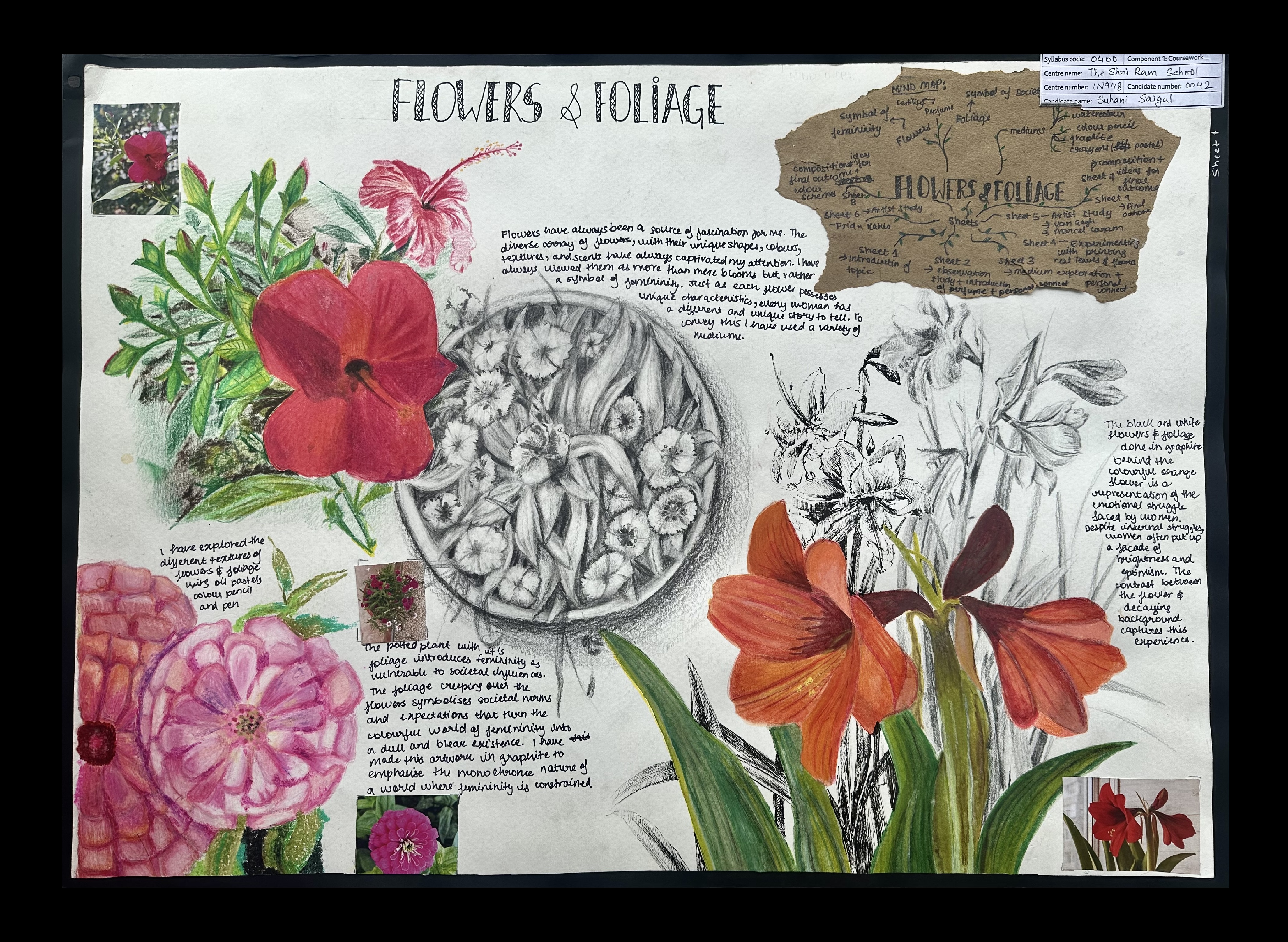 Since childhood, I've been captivated by the diverse array of flowers, and their unique shapes, colors, textures, and scents. To me, they symbolize femininity, with each bloom representing a woman's distinct characteristics and story. To portray this diversity, I've utilized various mediums, including graphite, colored pencil, oil pastel, watercolor, and pen. The image of a potted plant with its foliage encroaching upon the flowers reflects how societal norms can stifle the full expression of femininity. This intrusion threatens to dull the vibrant world of femininity, an idea emphasized through the use of monochromatic graphite. The contrast between a vivid orange flower and the somber black-and-white drawings behind it illustrates the emotional struggles women face, often masking inner turmoil with a facade of brightness.