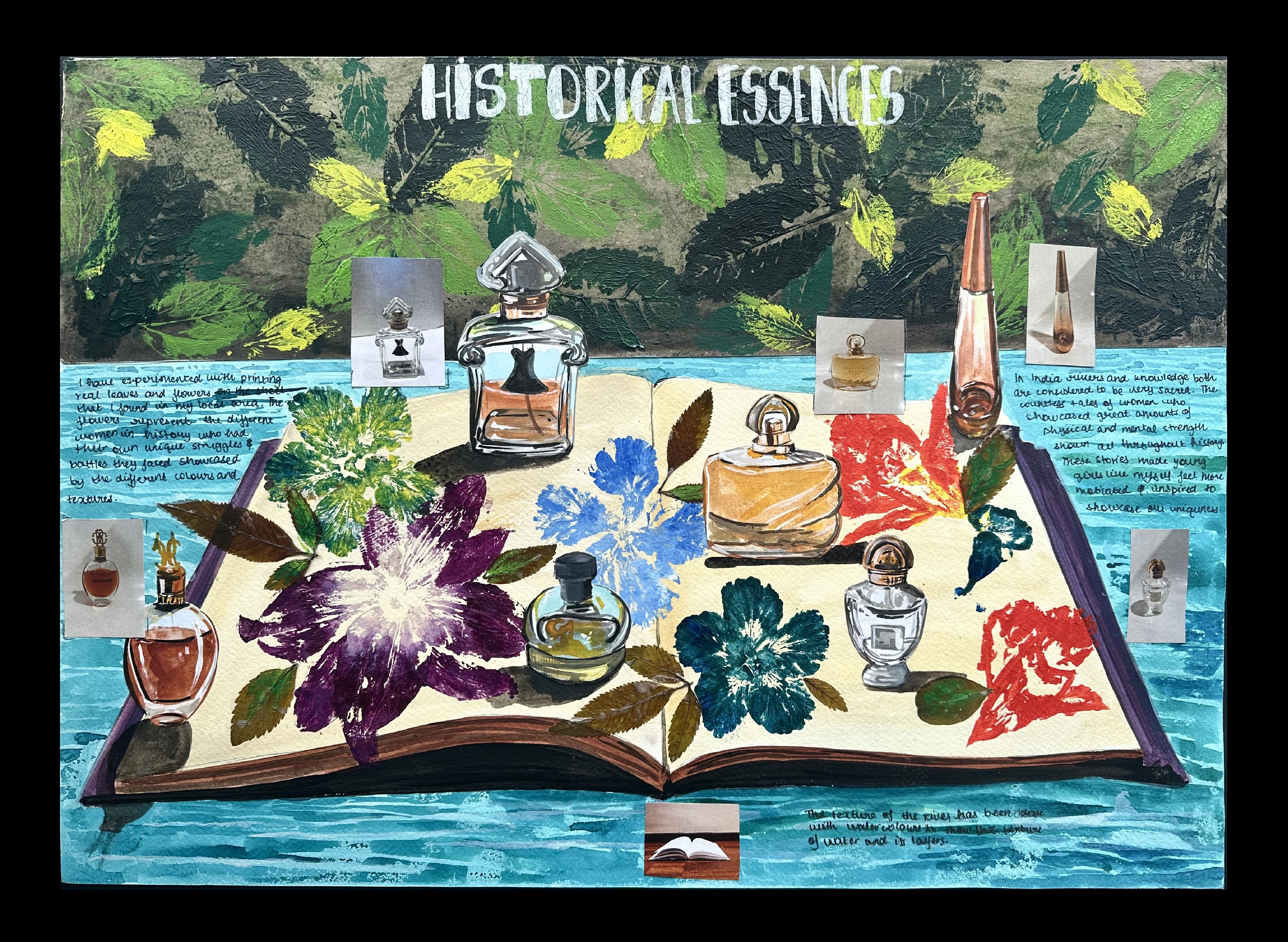 In India, rivers and knowledge are both deeply sacred, weaving into cultural narratives that honor women’s strength throughout history. Tales of women demonstrating remarkable physical and mental resilience have inspired young girls like me to embrace their own uniqueness. The perfume bottles in my work symbolize that inherited strength passed down through generations. I experimented with printing real leaves and flowers found locally, using their distinct colors and textures to represent different historical women and the unique battles they faced. By arranging the colored leaves into floral shapes, I highlight how Indian society is evolving into a more inclusive space for women’s self‑expression.