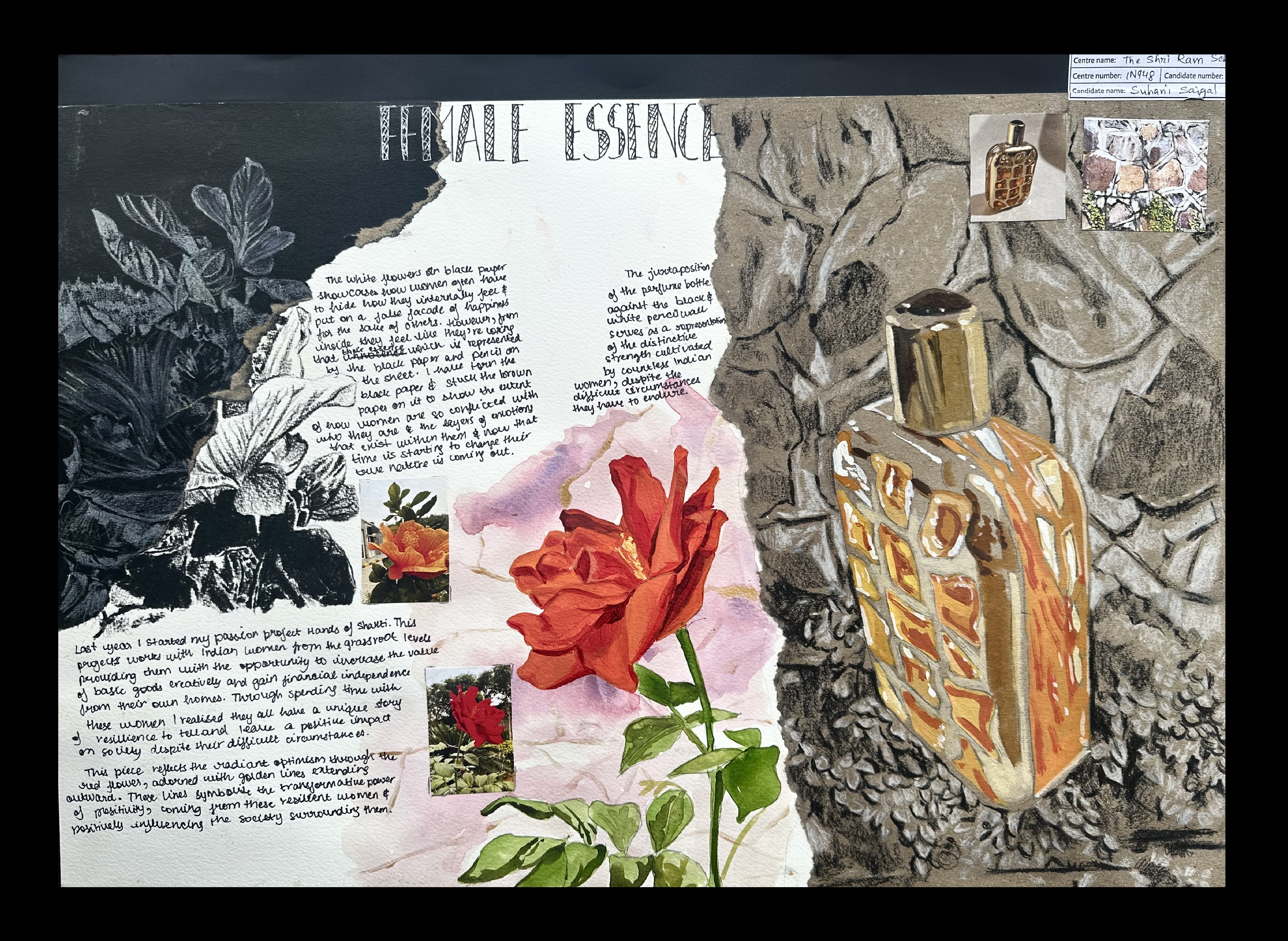 ‘Hands of Shakti’, an initiative that I launched last year, empowers Indian women to gain financial independence by applying their creativity to create unique, beautiful products that enhance everyday goods. Through working closely with these women, I witnessed their remarkable resilience and radiant positivity, embodied in a red flower with golden rays. These rays symbolize how their uplifting influence lightens even the darkest parts of their communities. The stark contrast of a pen‑hatched monochrome wall and a colorful perfume bottle illustrates the deep inner strength these women maintain amid adversity. White flowers on black paper reflect their hidden emotions behind a façade of happiness, while black pencil on white paper reveals a loss of essence beneath the mask. Finally, torn black paper patched with brown portrays their conflicted identities and the emotional complexity gradually emerging as times change.