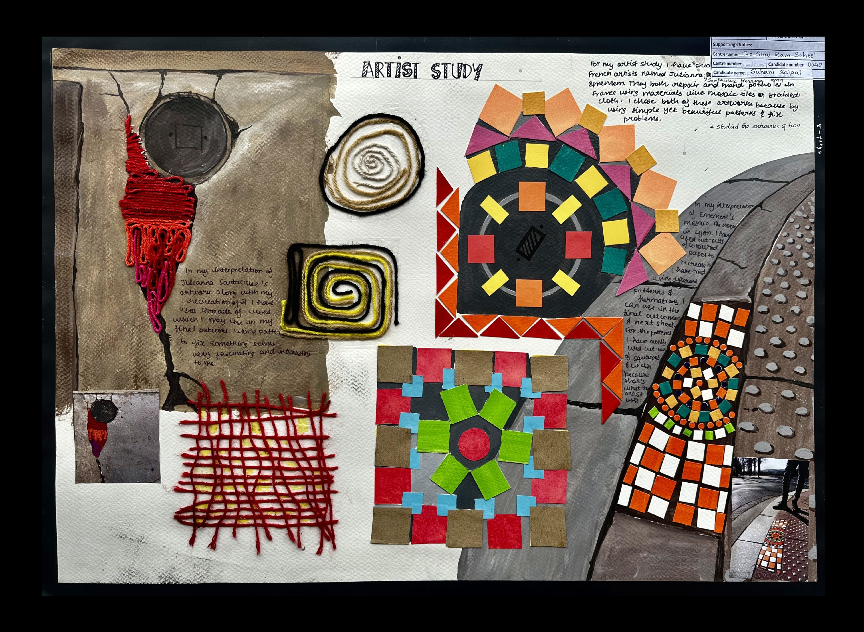 This sheet continues to explore ‘repair and mend’ by engaging with artists whose works resonated with my own experiences of fixing and restoring. On the left, I studied the works of Juliana Santacruz Herrera, recreating her stitched mends using wool and thread, layering spirals, weaving nets, and pairing them with a printed image of her work. Her transformation of broken pavements through colour and fibre, connecting with my earlier uses of yarn and patchwork, is visually grounding and personally meaningful. To contrast this, I studied French street artist Ememem, replicating his tiled interventions through layered paper cut-outs and symmetrical patterns. My final recreation blends a hand-rendered mosaic with a real photograph of his work, drawn into a street setting to reflect imagined and real repair. These studies allowed me to explore yarn and paper as symbolic tools of Jugaad, one intimate and soft, the other architectural and public.